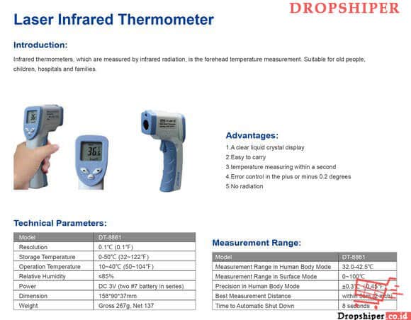 Laser Infrared Thermometer DT-8861 adalah sebuah thermometer yang berfungsi untuk mengukur suhu tubuh manusia untuk mengetahui tubuh seseorang demam atau tidak.
