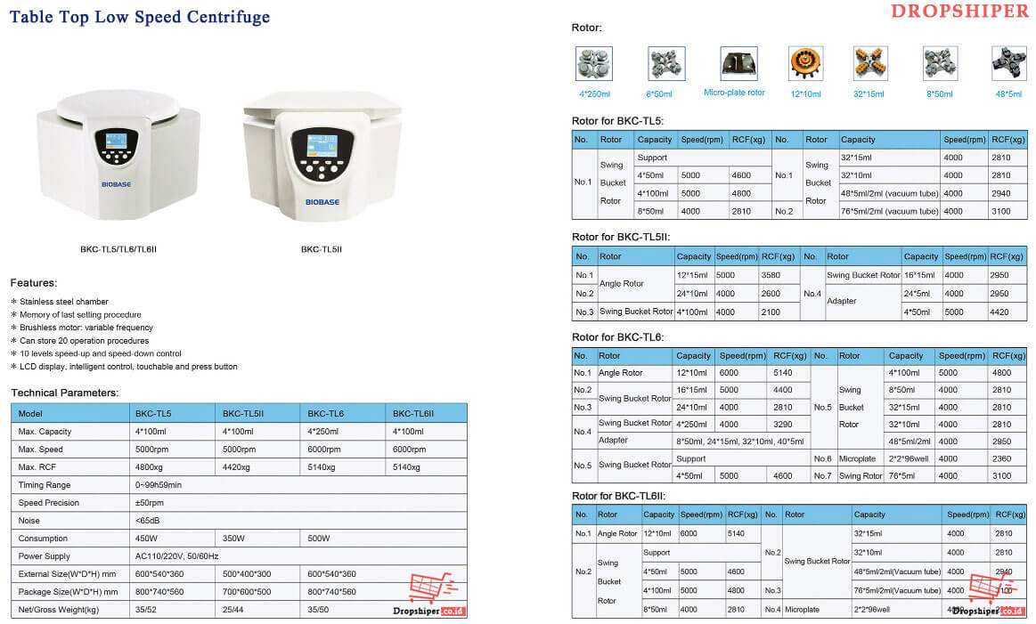 Table Top Low Speed Centrifuge BKC-TL Series ini Ada 4 Model yaitu; BKC-TL5, BKC-TL5II, BKC-TL6, Dan BKC-TL6II dimana perbedaan pada Table Top Low Speed Centrifuge BKC-TL Series ini untuk model BKC-TL5 Max. Capacity; 4*100ml, Max. Speed; 5000rpm, Max. RCF; 4800xg, Consumption; 450W, untuk model BKC-TL5II ini Max. Capacity; 4*100ml, Max. Speed; 5000rpm, Max. RCF; 4420xg, Consumption; 350W, Sedangkan untuk model BKC-TL6 ini Max. Capacity; 4*250ml, Max. Speed; 6000rpm, Max. RCF; 5140xg, Consumption; 500W, Dan untuk model BKC-TL6II ini Max. Capacity; 4*100ml, Max. Speed; 6000rpm, Max. RCF; 5140xg, Consumption; 500W. Dengan Adanya beberapa model pada Table Top Low Speed Centrifuge BKC-TL Series ini Anda dapat menyesuaikan dengan kebutuhan tertentu.