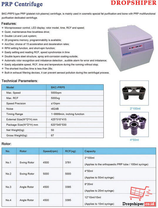Centrifuge Platelet Rich Plasma BKC-PRP5 merupakan sebuah alat pemutar yang terutama digunakan dalam pemurnian lemak khusus kosmetik dan tulang dengan pemurnian multifungsi PRP khusus centrifuge. Plasma darah kaya trombosit atau platelet rich plasma (PRP) adalah plasma yang telah diperkaya dengan trombosit. Kegunaan Alat Centrifuge PRP BKC-PRP5 ini yaitu sebuah peralatan yang sangat dibutuhkan dalam pemisahan partikulat padat dalam satu cairan dengan menggunakan prinsip gaya centrifugal ketika satu cairan dalam tabung diputar dengan kecepatan tinggi pada satu pusat, maka pertikel yang masanya lebih berat akan bergerak ke bagian bawah tabung, sehingga partikel yang lebih ringan berada di bagian atas tabung. Alat Centrifuge PRP BKC-PRP5 ini mampu berputar pada kecepatan 5000rpm, dan kebanyakan centrifuges BKC-PRP5 ini dilengkapi dengan sistem pendingin untuk menjaga sampel tetap dingin selama sentrifugasi.