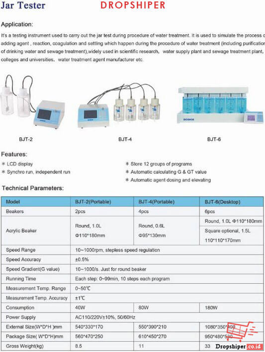 Pada Product ini Ada 3 pilihan yaitu; BJT-2, BJT-4 Dan BJT-6 dimana perbedaan pada Jar Tester ini untuk model BJT-2 Beaker; 2pcs, Gelas Akrilik; Round,1.0L Φ110*180mm, Konsumsi daya; 40W, Ukuran Eksternal (W * D * H) mm; 540*330*170, Ukuran Paket (W * D * H) mm; 560*470*250, Berat Kotor (kg); 8.5, Dan untuk model BJT-4 ini Beaker; 4pcs, Gelas Akrilik; Round, 0.6L Φ95*130mm, Konsumsi daya; 80W, Ukuran Eksternal (W * D * H) mm; 550*390*210, Ukuran Paket (W * D * H) mm; 610*450*270, Berat Kotor (kg); 11, Sedangkan untuk model BJT-6 ini Beaker; 6pcs, Gelas Akrilik; Round, 1.0L Φ110*180mm dan Square optional, 1.5L 110*110*170mm, Konsumsi daya; 180W, Ukuran Eksternal (W * D * H) mm; 1080*350*400, Ukuran Paket (W * D * H) mm; 950*480*530, Berat Kotor (kg); 33.