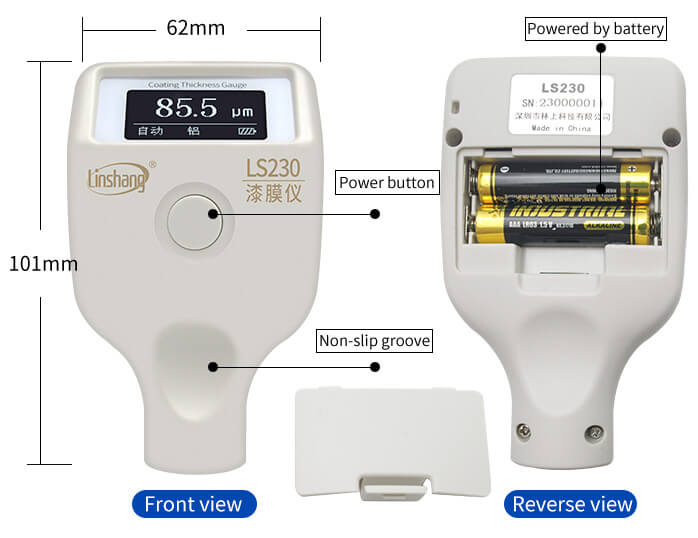 Automotive Paint Thickness Meters LS230 ini mengadopsi dua prinsip pengukuran yaitu induksi magnetik dan arus eddy, yang dapat mengukur ketebalan lapisan cat pada substrat logam seperti pelat baja (Fe) dan paduan aluminium (NFe). Selain itu, alat ini juga secara otomatis mengidentifikasi substrat non-logam.