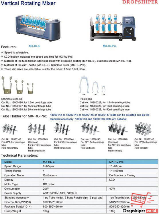Pada product ini Ada 2 pilihan yaitu; seri MX-RL-E Dan MX-RL-Pro dimana perbedaan pada Alat Mixer ini untuk seri MX-RL-E Speed Range; 0~80rpm, Timing Range; /, Operation Mode; Continuous, Display; /, Power Consumption; 20W, Sedangkan untuk seri MX-RL-Pro ini Speed Range; 10~70rpm, Timing Range; 1~1199min, Operation Mode; Continuous or Timing, Display; LCD, Power Consumption; 40W. Dengan Alat Pencampur Cairan MX-RL-Pro ini Anda tidak perlu kesulitan untuk melakukan pencampuran cairan.